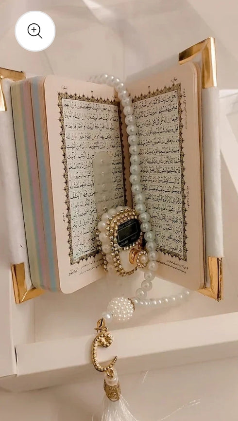 ✅ MATERIAL & SIZE – Set consists of Holy Qur'an Set with Pearl Prayer Beads and Digital Tasbih with Ribboned Box. The Pocket size Quran is easy to read as it is written using a computer. It's easy to carry around. Also made with Thermoskin Leather-bound that makes it looks and feels satisfying while reading and using as a decorative item. The dimensions of the Medium size Quran are 7.5 x 5.5 inch. You can use gift with ribboned gift box to the persons that you loves. Ribboned Gift Box (8 x 7 x 2.5 inch) The pearl rosary produced from natural replica pearl. Good quality raw material used to produce this product so it is durable and perfect choice. The set also comes with Digital Tasbih (Counter) which is easy to carry around with ring shaped finger holder. ✅ UNIQUE DESIGNS - Pocket size Quran, rosary set and tasbih counter with Ribboned box comes in a variety of colors and patterns, many based on traditional patterns, and will suit your unique style. It comes with 5 color options: Black, White, Gray, Pink, Gold ✅ EXCEPTIONAL QUALITY - Holy Qur'an Set with Pearl Prayer Beads and Digital Tasbih with Ribboned Box is made in Turkey with the best turkish workmanship and best turkish materials at an affordable price and is offered to you as an incredible value gift set. ✅ USAGE AND CARE – It should be wiped with a wet cloth and should not be left wet. ✅ GREAT VALUE – Holy Qur'an Set with Pearl Prayer Beads and Digital Tasbih with Ribboned Box is a meaningful gift that you can distribute to your loved ones on your special days. Your loved ones will use this gift for a long time and remember you with good memories.